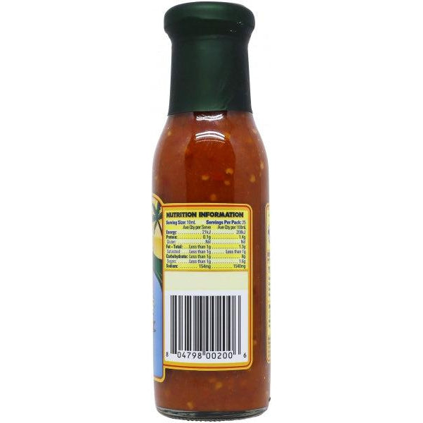 Ingredients: Water, cayenne chillies (41%), salt, lime juice (10%), spices, food acid (260) vegetable gum (415).