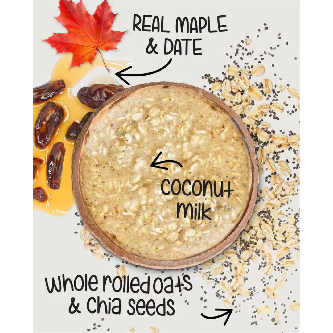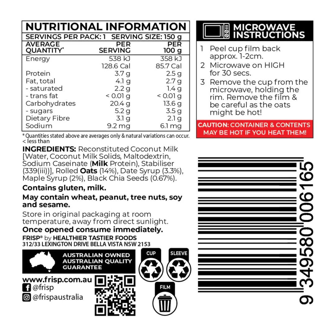 Ingredients: Coconut Milk, Rolled Oats (14%), Date Syrup (3.33%), Maple Syrup (2%), Black Chia Seeds (0.67%).