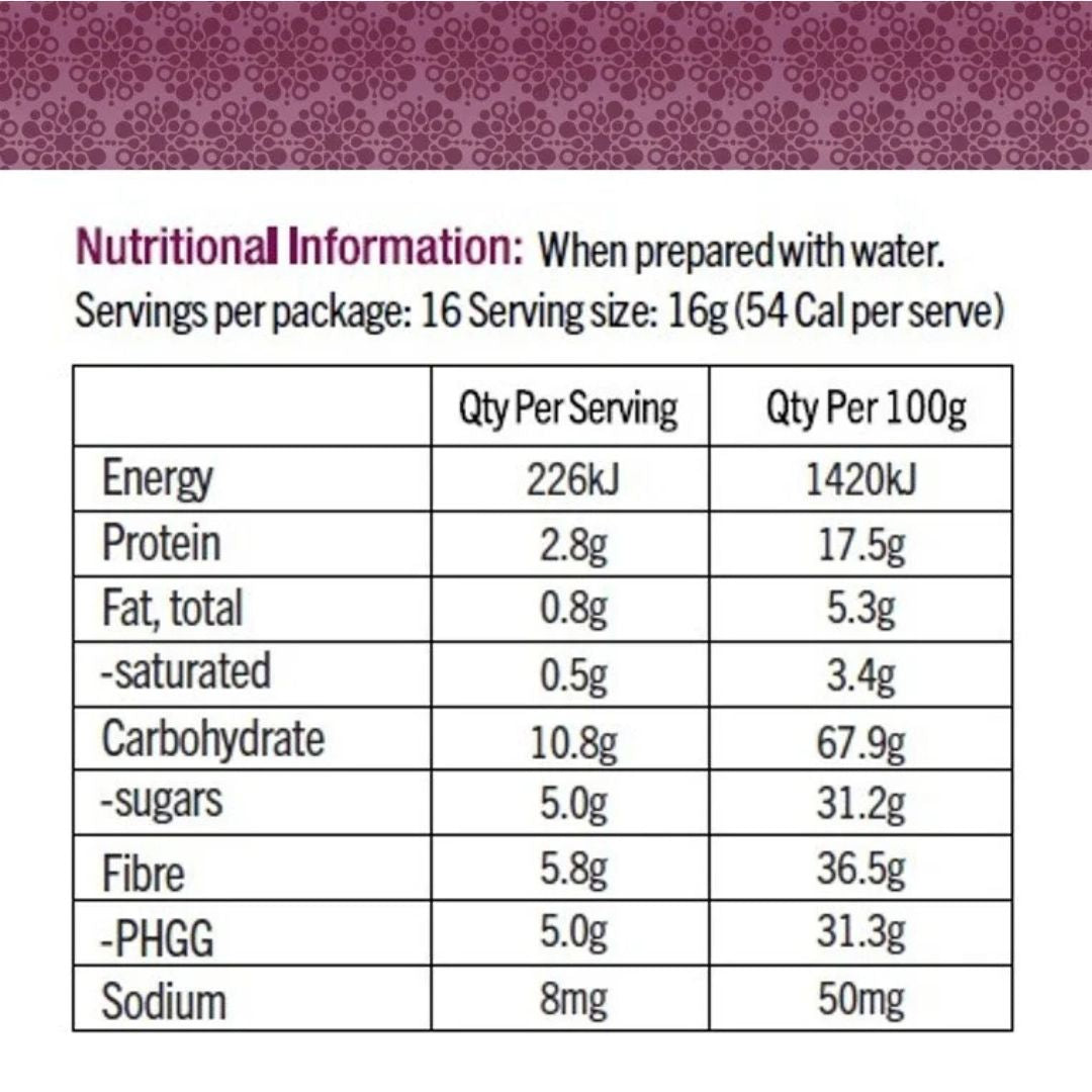 Serving size information: A 16g serve is low FODMAP, 16 serves per 256g pack.