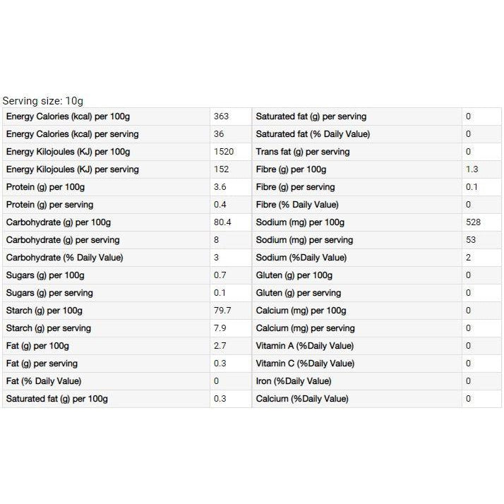 Ingredients: Rice Flour (22%), Tapioca Starch, Maize Starch, Chia Seeds (2.5%), Iodised Salt, Emulsifier: Sunflower Lecithin, Natural Colour, Vegetable Gum (Thickener): Xanthan Gum. Rosemary Extract.