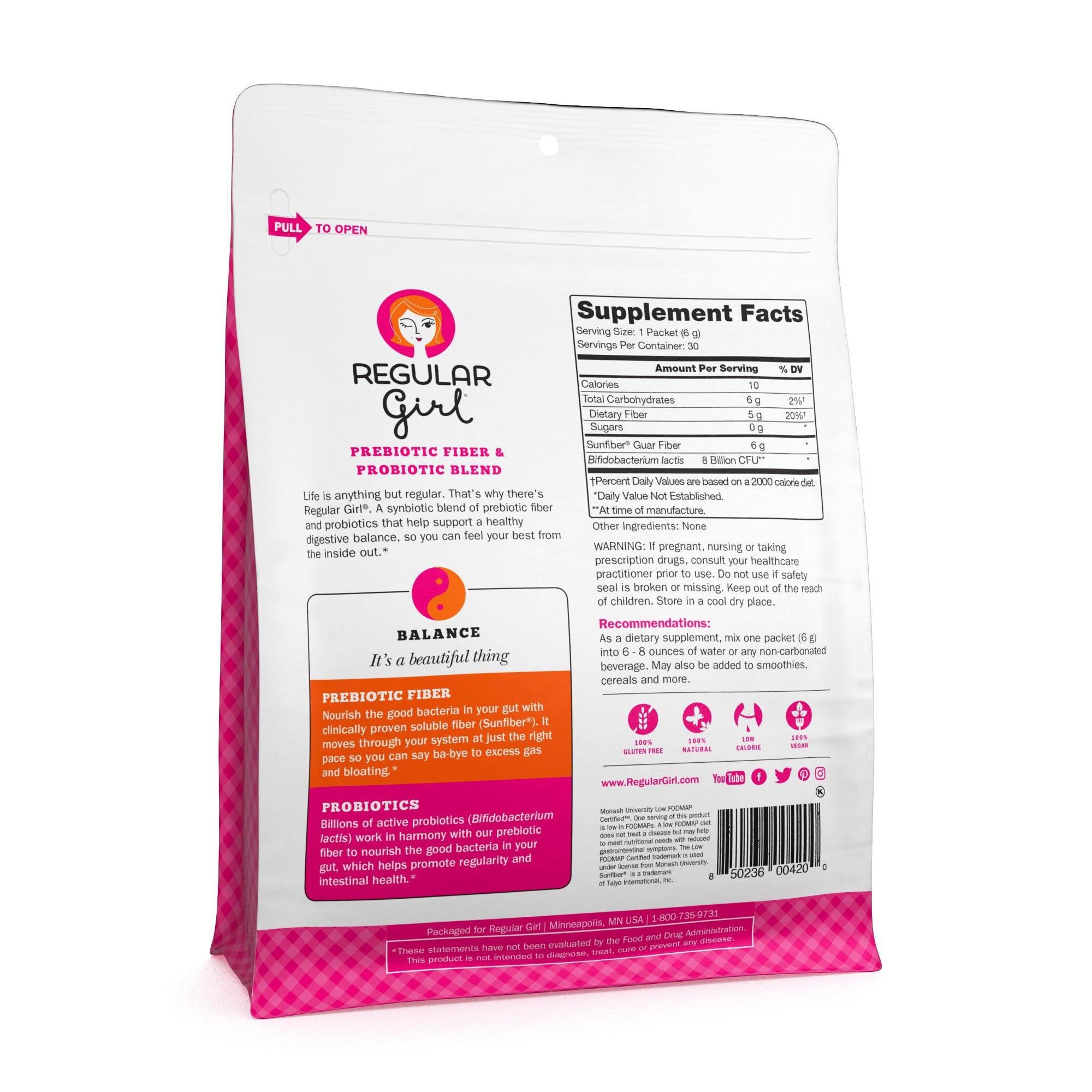 Regular Girl contains 8 billion active and clinically proven probiotics (Bifidobacterium lactis) that work in harmony with our Prebiotic Fiber, forming a union that maintains regularity and promotes wonderfully balanced intestinal health.*