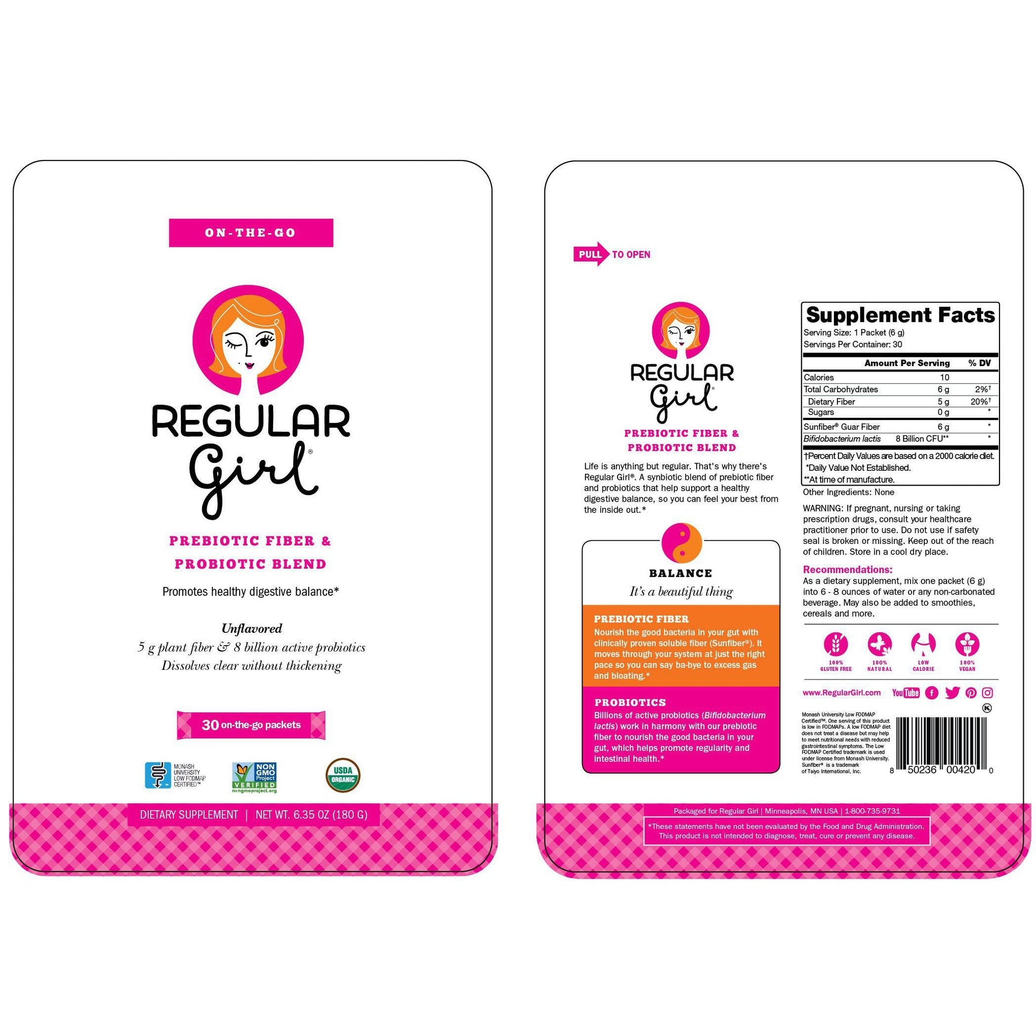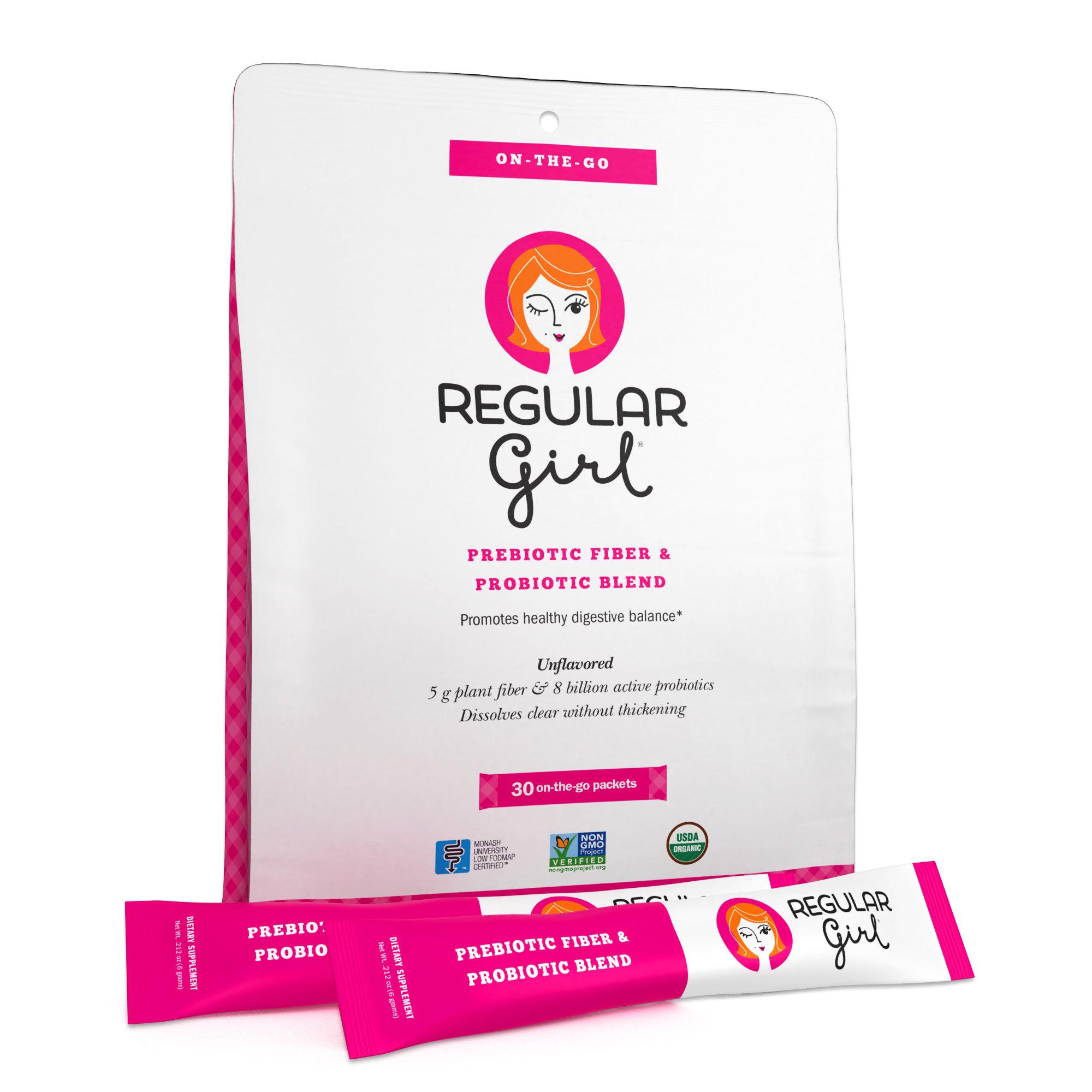 Regular Girl is a synbiotic blend of clinically proven prebiotic fiber and probiotics that help maintain a healthy digestive balance. Just one serving of Regular Girl, and the comfort of a balanced day is yours. You won't taste the difference, but you'll feel the benefits, enabling you to always feel comfortable, in control, and radiate confidence.*