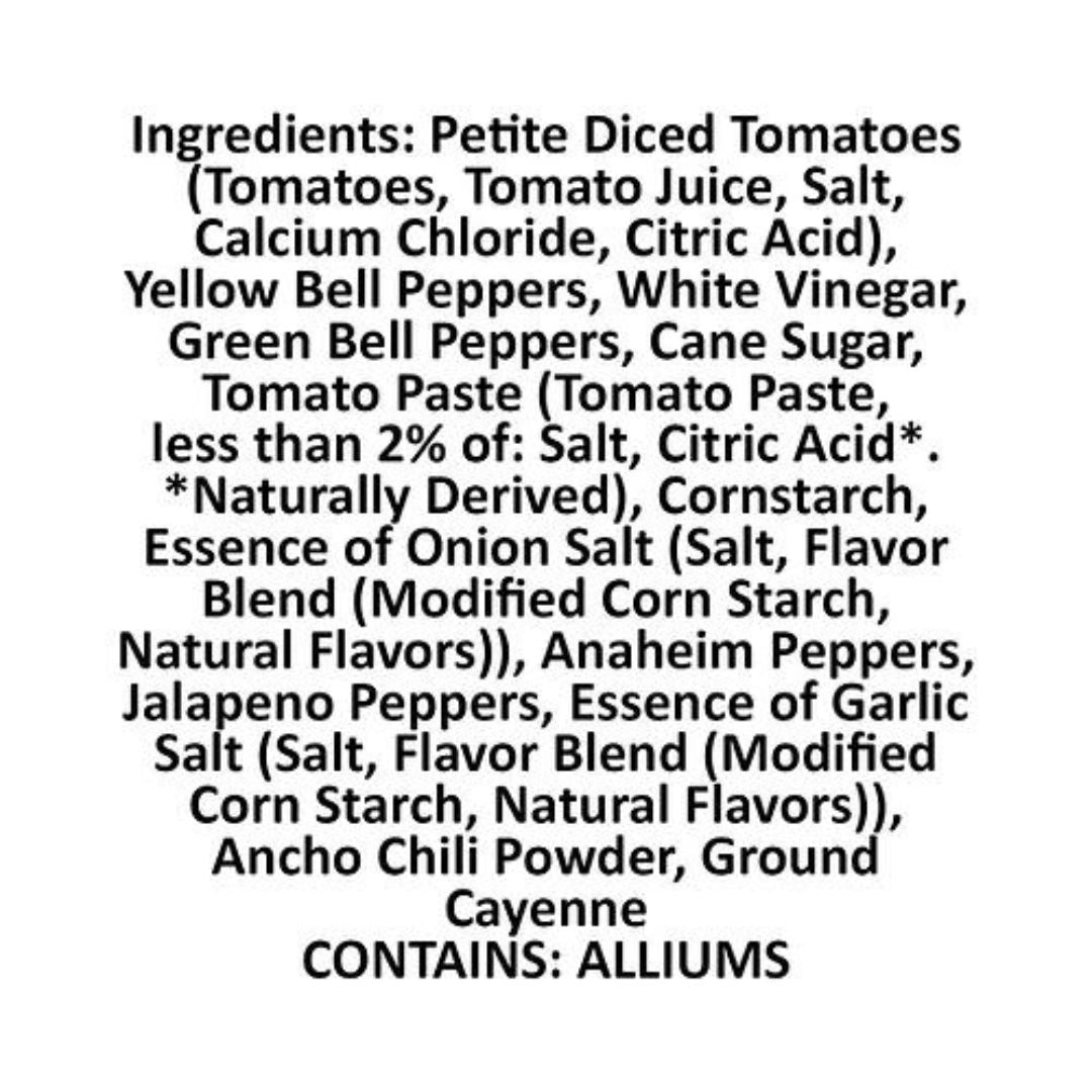 Ingredients: Petite Diced Tomatoes (Tomatoes, Tomato Juice, Salt, Calcium Chloride, Citric Acid), Yellow Bell Peppers, White Vinegar, Green Bell Peppers, Cane Sugar, Tomato Paste (Tomato Paste, less than 2% of: Salt, Citric Acid*. *Naturally Derived), Cornstarch, Essence of Onion Salt (Salt, Flavor Blend (Modified Corn Starch, Natural Flavors)), Anaheim Peppers, Jalapeno Peppers, Essence of Garlic Salt (Salt, Flavor Blend (Modified Corn Starch, Natural Flavors)), Ancho Chili Powder, Ground Cayenne.