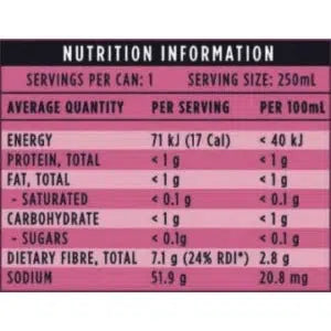 Ingredients: Sparkling water, prebiotic acacia gum fibre (3.4%), natural flavour, citric acid, Natural colours (red beet extract), Thaumatin (natural protein-based sweetener).