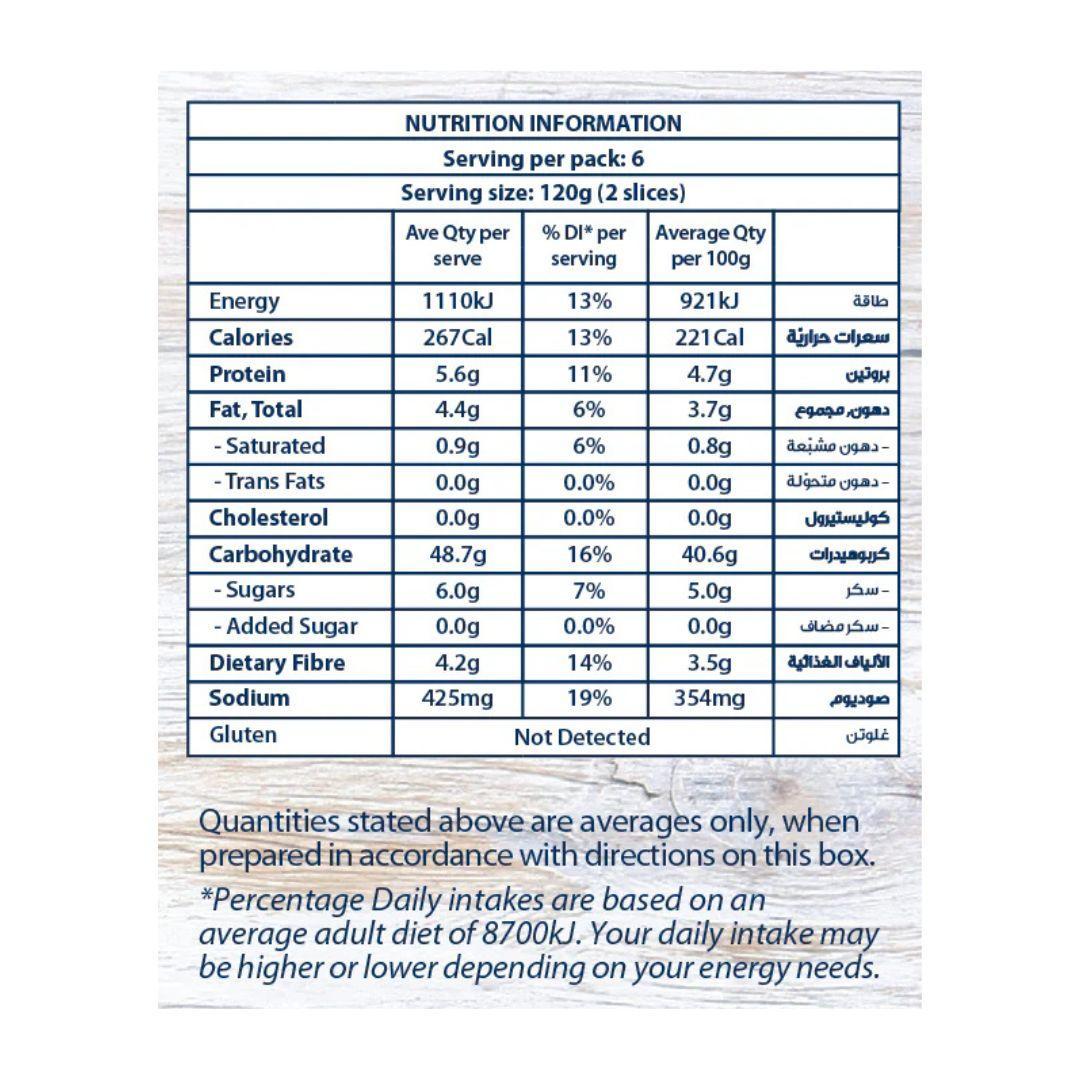 Serving size: A 120g serve (2 slices) is low FODMAP, 6 serves per 400g pack.