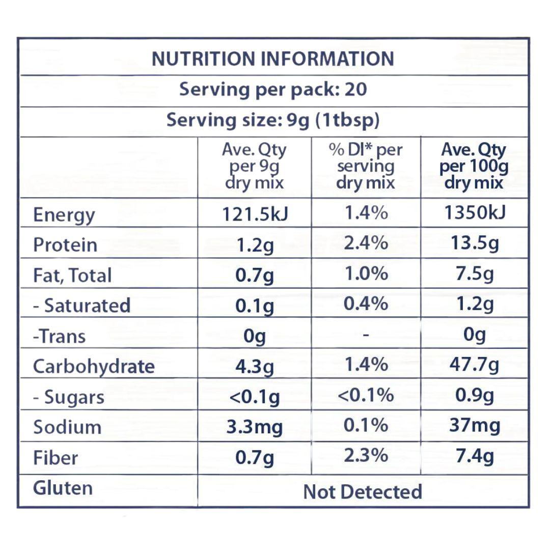 Serving size: A 9g serve (1 tbl) is low FODMAP, 20 serves per 180g pack.